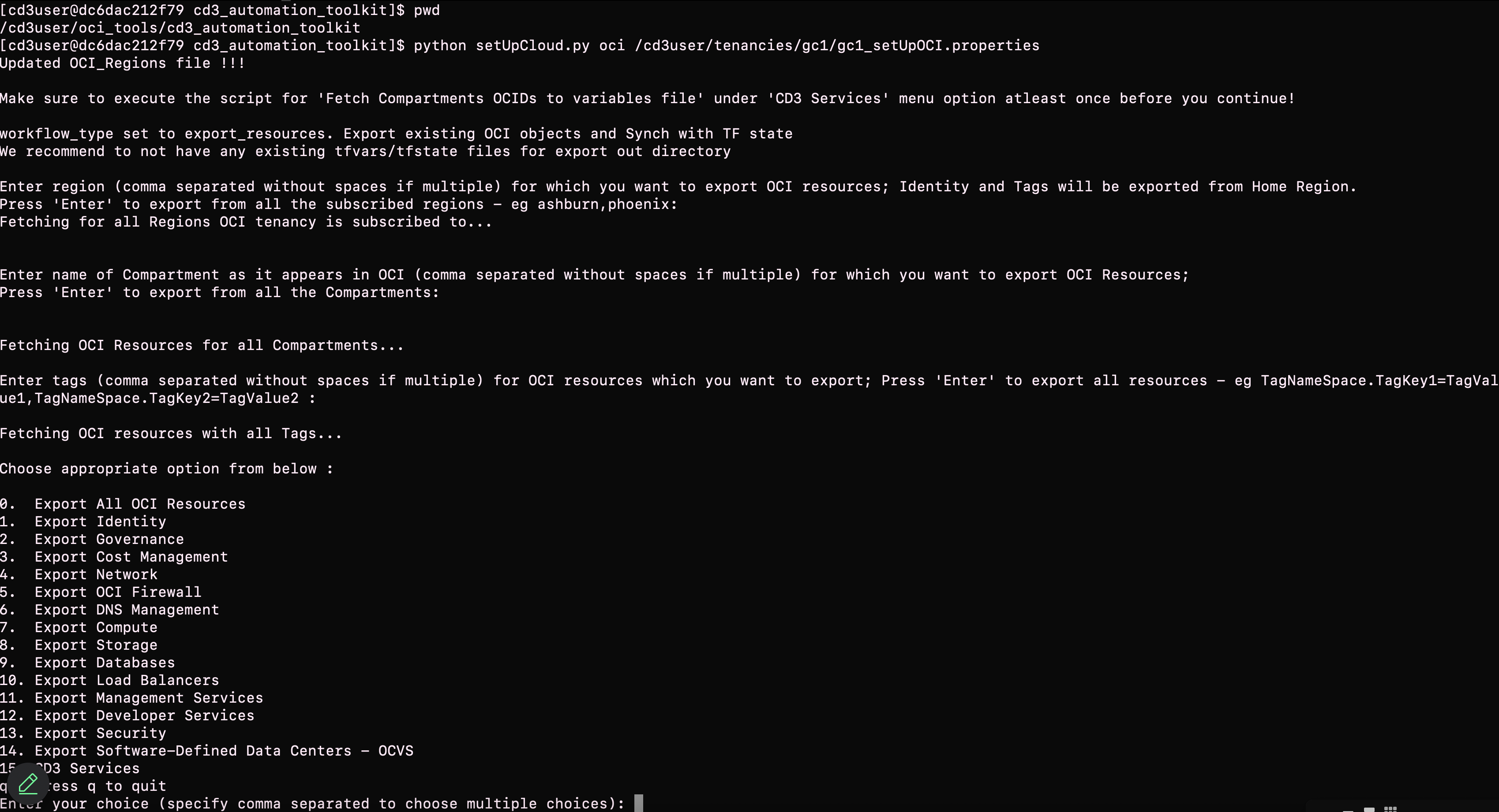 ⬆️ This prompt appears when executing the toolkit for the very first time or when any new compartments are created using the toolkit. Enter 'y' to fetch the details of compartment OCIDs into variables file.