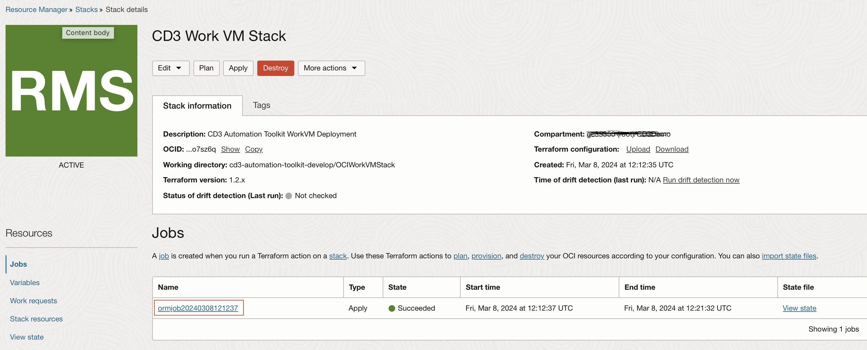 Click on the below button to directly navigate to Resource Manager stack in the OCI Tenancy, and fill in required details to launch CD3 Work VM and Container.