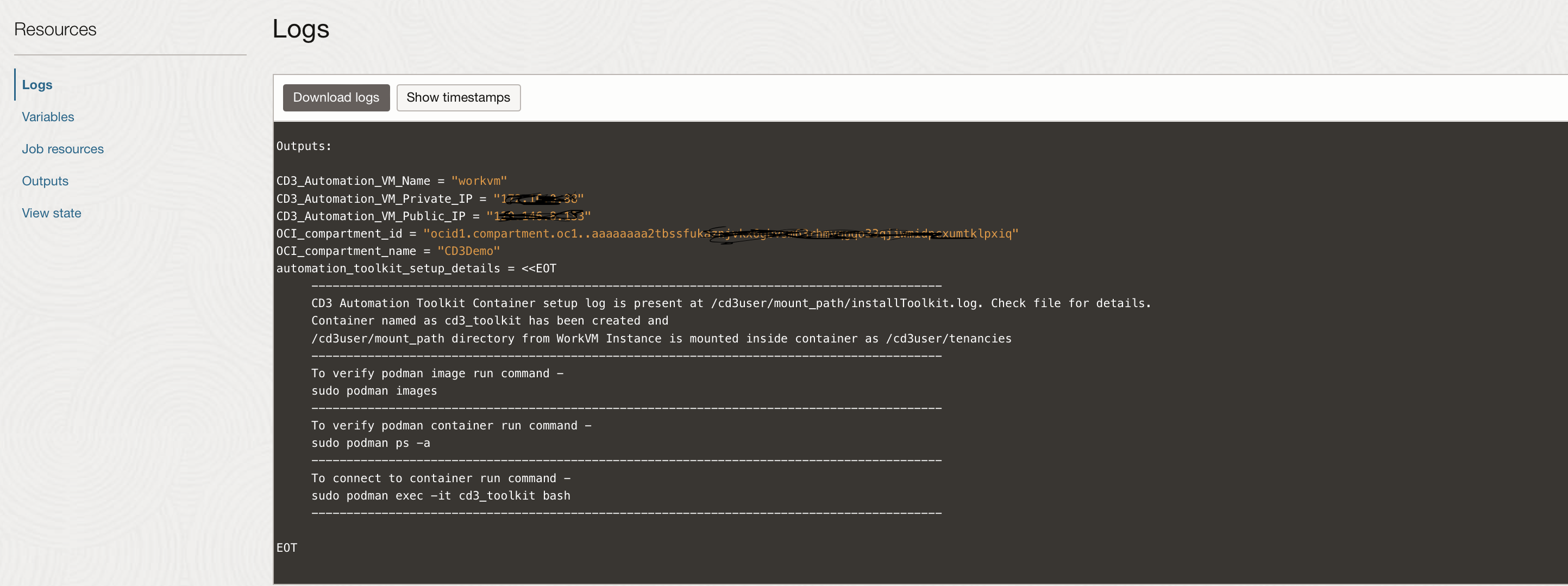 This action initiates login to OCI, provisions the Work VM in the tenancy, and configures the Automation Toolkit within a Podman container on the VM.